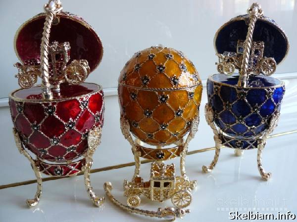 *** Parduodu garsios ,,FABERGE" firmos juvelyrikos stebuklą ,nuostabaus grožio, dengtus emaliu ir puoštus Svarovskio kristalais bei dirbtinais perlais, kiaušinius. Šie kiaušiniai yra kopijos ir pagaminti jie iš specialaus juvelyrinio metalo kuris kaip ir auksas yra sunkus ir nesioksiduojantis. Mėlynos, raudonos ir rožinės spalvos kiaušiniai pavadinimu "Pakalnutės" yra su muzikiniu siurprizu. Pakėlus viršutinę kiaušinio dalį galima prisukti specialų mechanizmą ir išgirsti mielą muzikytę ir dar galima panaudoti šį kiaušinį kaip dėžutę į kurią yra galimybė patalpinti na pvz. kad ir sužadėtuvių žiedą... :) . Šio kiaušinio aukštis 17 cm. svoris 500 gr. kaina 220 eur . Antrasis kiaušinis vadinasi ,,Karūnacinis" ir susideda jis iš keturių dalių, šiame kiaušinyje taip pat atsidaro viršutinė jo dalis ir prisukus mechanizmą jame taip pat groja muzikytė o tuo pat metu aplink savo ašį sukasi auksu tviskanti karieta. Šio kiaušinio aukštis 20 cm. sveria jis 1100 gr. kaina 330 eur (yra mėlyna,geltona ir raudona spalvos). O taip pat yra daugybė kitų nuostabaus grožio kiaušinių kuriuos jūs galėsite išsirinkti ir užsisakyti iš katalogo. Kainos sutartinės. Šie kiaušiniai yra pagaminti dabar jau naujai atsikūrusioje garsioje visame pasaulyje juvelyrinėje įmonėje "Faberge" kuri nuo Carinių laikų yra įsikūrusi Sankt Peterburge. Kiaušiniams supakuoti yra skirta speciali aukso spalvos dėžutė. Tai nuostabi dovana artimam žmogui ar papuošalas jaukioje namų aplinkoje. Daugiau informacijos tel. +370 605 45548 !!! Yra galimybė kiaušinius siųsti paštu. Daugiau kiaušinių foto: https://www.alio.lt/skelbimai/***-parduodu-nuostabaus-grozio-faberge-kiausinius