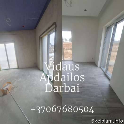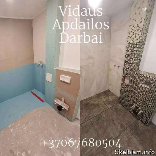 Atliekame tokius darbus kaip: Sienų glaistymas Sienų dažymas Dekoratyvinis tinkavimas ar dažymas Tapetų klijavimas Sienos defektų šalinimas arba pilnas sienų pertinkavimas Parketlenčių, laminato, vinilinės dangos klojimas Plintusų montavimas Elektros darbai Gipso kartono montavimas Gipso kartono Frezavimas Plytelių klijavimas 45 laipsių kampo formavimas Mozaikos klijavimas Plytelės plintuso pjovimas Dušo trapo montavimas Dušo nuolydžio formavimas, betonavimas Hidroizoliacijos įrenginmas Maišytuvų, klozetų, kriauklių, gyvatukų bei kitos vonios įrangos montavimas Kreipkitės +37067680504 www.vidaus-apdaila.eu