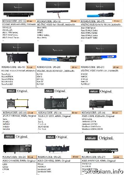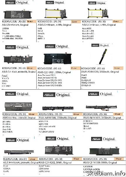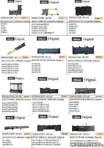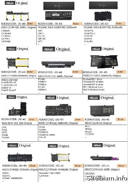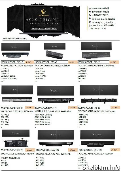 kaina: 17 vieta: Šiauliai / VISA LIETUVA ASUS ir kitų nešiojamų kompiuterių baterijos geriausia kaina! Nurodyti ne visi modeliai. Pristatymas visoje Lietuvoje per 1-2 d.d. (DPD kurjeriu, paštomatu, paštu, galima atsiimti vietoje). Visa konsultacija, remonto darbų užsakymas: +37063977277 / info@marsietis.lt / Vilniaus 230, Šiauliai arba Tilžės 107, Šiauliai Daugiau informacijos: www.marsietis.lt 1. VOLTAIC ASUS A32-K55, 5200mAh. A32-K55; A33-K55; A41-K55. Kaina 38 eur. 2. VOLTAIC ASUS A32-N56, 5200mAh. A31-N56, A32-N56, A33-N56. Kaina 35 eur. 3. VOLTAIC ASUS A32-M50, 5200mAh. A32-M50; A32-N61; A33-M50; A32-X64; L072051; 15G10N373830; 15G10N373800; 90-NED1B2100Y. Kaina 35 eur. 4. VOLTAIC ASUS A32-K52, 5200mAh. 70-NXM1B2200Z; 90-NYX1B1000Y; A31-K52; A32-K52; A41-K52; A42-K52; A31-B53; K52L681. Kaina 35 eur. 5. VOLTAIC ASUS A41-X550, 4400mAh. A41-X550; A41-X550A. Kaina 35 eur. 6. VOLTAIC ASUS A41N1308, 2600mAh. 0B110-00250100; A41N1308; A31LJ91; A31N1319; A41N1308; X45LI9C; YU12008-13007D; YU12125-13002. Kaina 35eur. 7. VOLTAIC ASUS B21N1329, 4040mAh. 0B200-00840000; B21N1329. Kaina 36 eur. 8. VOLTAIC ASUS A32-K56, 2200mAh. A31-K56; A32-K56; A41-K56; A42-K56. Kaina 25 eur. 9. VOLTAIC ASUS A32-K53, 4400mAh. A32-K53; A42-K53. Kaina 26 eur. 10. VOLTAIC ASUS A41-X550, 2200mAh. A41-X550; A41-X550A. Kaina 11.00 eur. 11. VOLTAIC ASUS A41-X550E, 2600mAh. Kaina 33 eur. 12. VOLTAIC ASUS X540 Series A31N1519, 2600mAh. Kaina 30 eur. 13. VOLTAIC ASUS C21N1347, 4900mAh. Kaina 45 eur. 14. VOLTAIC ASUS A31N1601, 2600mAh. 0B110-00440000. Kaina 28 eur. 15. VOLTAIC ASUS A31N1537, 2600mAh. 0B110-00420300. Kaina 28 eur. 16. ASUS C21N1508, 38Wh, Original. Kaina 33 eur. 17. ASUS c31-s551, 48Wh, Original. Kaina 50 eur. 18. ASUS U38N, 6520mAh, Original. UX32 Series Zenbook UX32A; Zenbook UX32VD; VivoBook U38N Series; VivoBook U38N-C4004H. Kaina 88eur. 19. ASUS C41-N550, 59Wh, Original. Kaina 90 eur. 20. ASUS C31-X502, 38Wh, Original. Kaina 40 eur. 21. ASUS A41N1424, 48Wh, Original. A41N1424; X55LM2H; 0B110-00231100; 0B110-00231100M. Kaina 52 eur. 22. ASUS B21N1329, Original. Kaina 54 eur. 23. ASUS C21N1401, 37Wh, Original. C21IN401; C21INI401; C21N1401. Kaina 32 eur. 24. ASUS C21N1347, 37Wh, Original. Kaina 63 eur. 25. ASUS C21-X502, 4000mAh, Original. C21-X502; C21-X502CA. Kaina 60 eur. 26. ASUS C23-UX21, 35Wh, Original. Kaina 65 eur. 27. ASUS A31N1519, 3200mAh, Original. Kaina 43 eur. 28. ASUS A32-N56, 5200mAh, Original. A31-N56; A32-N56; A33-N56. Kaina 48 eur. 29. ASUS A41N1308, 2550mAh, Original. A31N1319; A41N1308; 0B110-00250100M; X45LI9C; YU12008-13007D. Kaina 53 eur. 30. ASUS A41N1611, 3150mAh, Original. 0B110-00470000. Kaina 53 eur. 31. ASUS A41-X550A, 2950mAh, Original. A41-X550A; 0B110-00230100; 0B110-00230100M. Kaina 53 eur. 32. ASUS C21-X202, 38Wh, Original. Kaina 55 eur. 33. ASUS C31N1339, 50Wh, Original. 0B200-9300000; 3ICP7/55/90. Kaina 59 eur. 35. ASUS C31N1428, 56Wh, Original. C3INI428; C31N1428; C31NI428; C31PQC1; C3IN1428. Kaina 50 eur. 36. VOLTAIC ASUS A32N1405, 5200mAh. G551; N551; N751; G58; G771; A32N1405. Kaina 50 eur. 37. VOLTAIC ASUS A32N1405, 5200mAh. G551; N551; N751; G58; G771; A32N1405. Kaina 50 eur. 38. VOLTAIC ASUS B31N1726, 4240mAh. B31N1726. B31N1726-1. B31BnEH. B31Bn91. A41LK9H. Kaina 35 eur. 39. ASUS C21N1509, 5000mAh, Original. 0B200-01750000. Kaina 48 eur. 40. ASUS A32N1331, 44Wh, Original. A32N1331; A33N1332. Kaina 43 eur. 41. ASUS C22-UX31, 6840mAh, Original. Kaina 70 eur. 42. ASUS B21N1505, 32W, Original. Kaina 50 eur. 43. ASUS C31N1528, 4680mAh, Original. Kaina 58 eur. 43. ASUS C32-N750, Original. Kaina 70 eur. 44. ASUS C31N1620, 4335mAh, Original. 0B200-03420200. 3ICP5/70/81. C31N1620. C31N1620, C31N162O, C3iNi62O, C3iNi620, C3iPOJi, C31POJ1, C3iP0Ji, C31P0J1, 0B200-02860000, 0B200-02370000, 0B200-02370200, 0B200-02370100. Kaina 70 eur. 45. ASUS C21N1638, 4940mAh, Original. Kaina 35 eur. 46. ASUS A31N1719, 2900mAh, Original. A31N1719. 0B110-00520500. 0B110-00520200. A31L04Q. A31N11719-1. Kaina 50 eur. 47. ASUS B31N1637, 3653mAh, Original. B31N1637. C31N1637. B31BI2H. 0B200-02590000. 0B200-02590100. 0B200-02590200. 0B200-02590300. B31Bi2H. B31Bi9H. Kaina 60 eur. 48. ASUS C21N1634, 5000mAh, Original. B31N1637. C31N1637. B31BI2H. 0B200-02590000. 0B200-02590100. 0B200-02590200. 0B200-02590300. B31Bi2H. B31Bi9H. Kaina 53 eur. 49. ASUS A31N1601, 3350mAh, Original. A31N1601. A31N1537. A31LP4Q. Kaina 45 eur. 50. ASUS B31N1707, 3653mAh, Original. 0B200-02710000. B31N1707-1. Kaina 65 eur. 51. ASUS C41N1531, 4120mAh, Original. 0B200-01940100. Kaina 80 eur. 52. ASUS C31N1431, 4840mAh, Original. 0B200-01600200. 0B200-01600300. 0B200-01600000. 0B200-01600400. Kaina 62 eur. 53. ASUS C41N1541, 5000mAh, Original. 0B200-02070000. 0B200-02070200. 0B200-02070300. C41PP91. Kaina 75 eur. 54. ASUS B31N1424, 4240mAh, Original. 0B200-01390000. Kaina 61 eur. 55. ASUS A31N1319, 2900mAh, Original. A31N1319. A31LJ91. A31LJ21. A31L04G. Kaina 60 eur. 56. ASUS C42N1630, 4652mAh, Original. 0B200-02520000. 4ICP5/41/75-2. C42N1630. C42PHCH.. Kaina 100 eur. 57. ASUS C31N1806, 3550mAh, Original. 0B200-02960000. 0B200-03030000. 0B200-03030100. 3ICP5/58/78. C31N1806. C31PIJ1. Kaina 72 eur. 58. ASUS B31N1822, 3550mAh, Original. B31N1822. 0B200-03220000. 0B200-03220100. 3ICP5/57/80. B31Bi2H. B31BIEH. B31B1EH. Kaina 68 eur. 59. ASUS C41N1524, 4755mAh, Original. C41N1524. 0B200-01250200. Kaina 75 eur. 60. ASUS C31N1602, 4940mAh, Original. 0B200-02090000. Kaina 73 eur. 61. ASUS C41N1712, 3255mAh, Original. C41N1712. 0B200-02380100. 0B200-02380200. 4ICP4/72/75. C41PKC5. Kaina 59 eur. 62. ASUS C21N1714, 5065mAh, Original. 0B200-02740000. Kaina 70 eur. 63. ASUS C21N1818-1, 4850mAh, Original. Asus C21n1818-1. Asus C21N1818. Asus 0B200-03280500. Asus C21PpJH. Asus 0B200-03190800. Asus 2ICP7/54/83. Asus C21PPJH. Kaina 58 eur. 64. ASUS B31N1632, 3653mAh, Original. B31N1632. 0B200-02540000. 0B200-02540300. Kaina 73 eur. 65. ASUS C21N1333, 4900mAh, Original. C21N1333. 0B200-00860000. 0B200-00860100. 0B200-008602