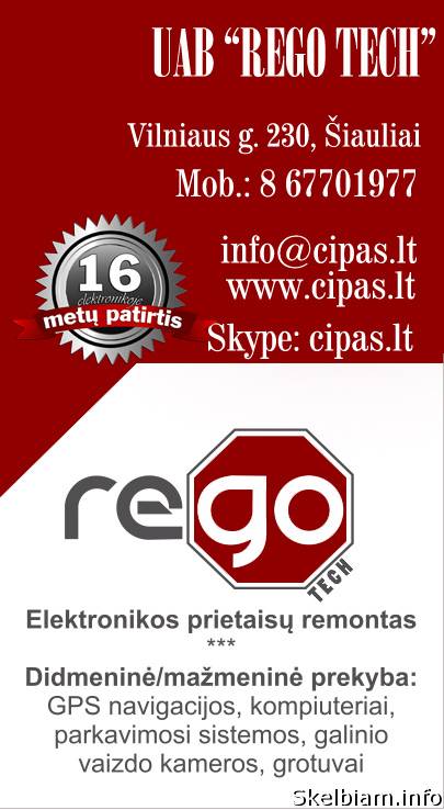 Atvykite į UAB Rego Tech Šiauliuose ir patikėkite savo navigaciją mums. Mes akimirksniu atnaujinsime programinę įrangą. Taip pat įdiegsime naujausius Lietuvos, Europos ar net pasaulio žemėlapius. Rekomenduojame Jums žemėlapius ir programinę įrangą atnaujinti bent kartą per metus arba prieš keliones (ypač į mažai žinomas arba nepažįstamas vietas). Atnaujiname IHEX, TomTom, Garmin, MIO, Navigon, IGO, Navisat, Navigon ir kitų prekinių ženklų navigacijas. VISO PASAULIO ŽEMĖLAPIŲ DIEGIMAS, GPS ATMINTIES PRAPLĖTIMAS, ĮDIEGTŲ ŽEMĖLAPIŲ NAUJINIMAS, GREIČIO KAMERŲ, LANKYTINŲ VIETOVIŲ, DEGALINIŲ DIEGIMAS, SUNKVEŽMIŲ PROGRAMŲ DIEGIMAS ir t.t. MUS RASITE: www.pirkciau.lt; Parduotuvė: Vilniaus g. 230, Šiauliai; El.p. info@pirkciau.lt; Skype: rego-gps;kirta patogiam Mob.: 863977277; Darbo laikas: I-V: 9-18 val., VI: 9-14 val. Kaina: 10 EUR